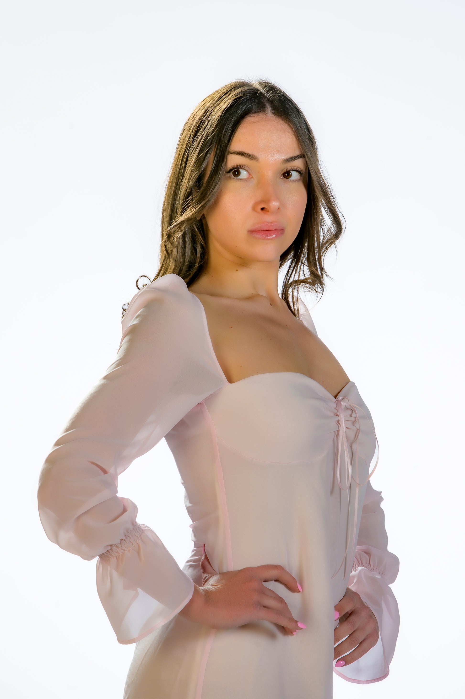 Abito leggero, corto, rosa, in viole. Maniche trasparenti e spalline a sbuffo.