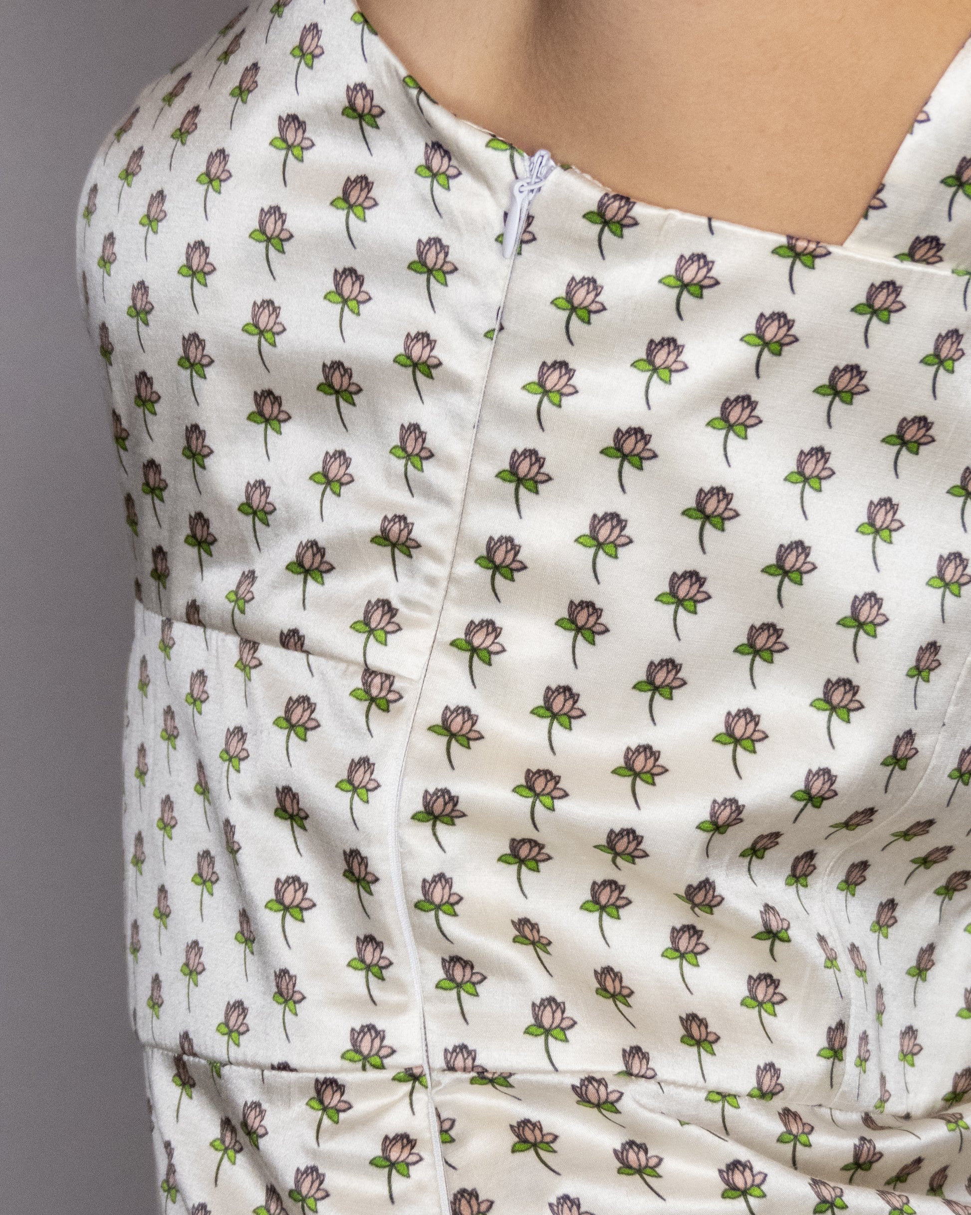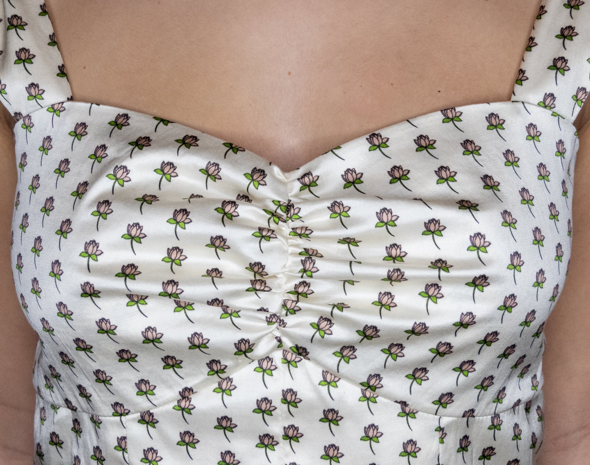 Abito con spalline regolabili. Scollo a cuore con ruches. Gonna a campana. Fodera interna e zip invisibile laterale.