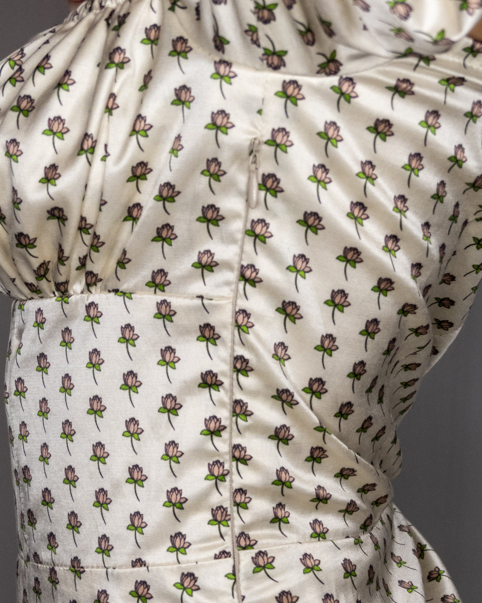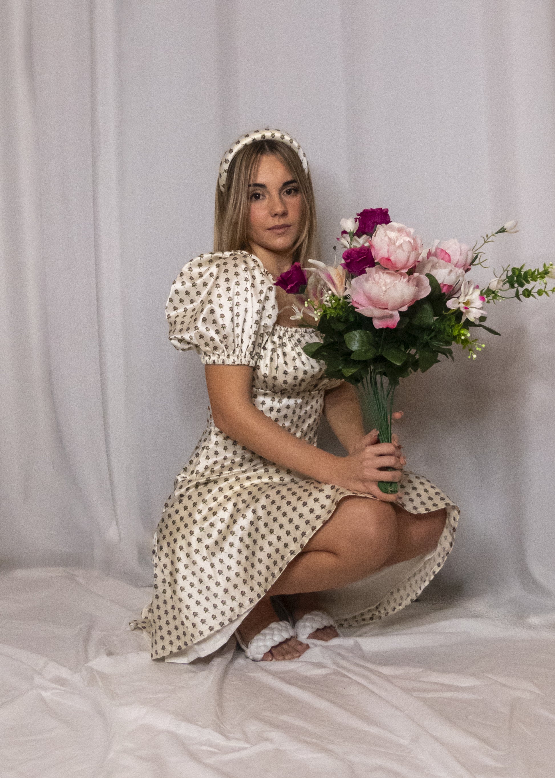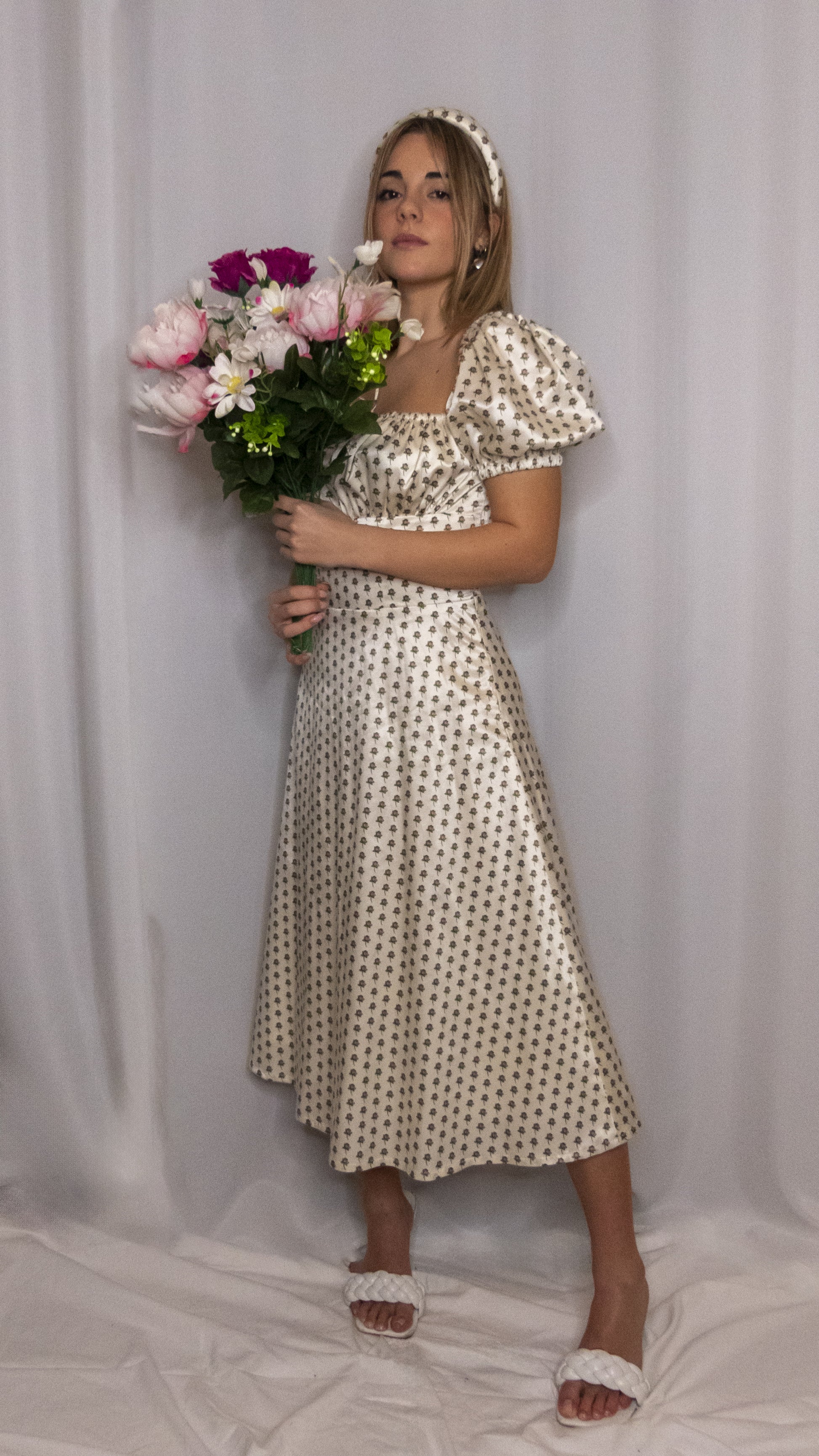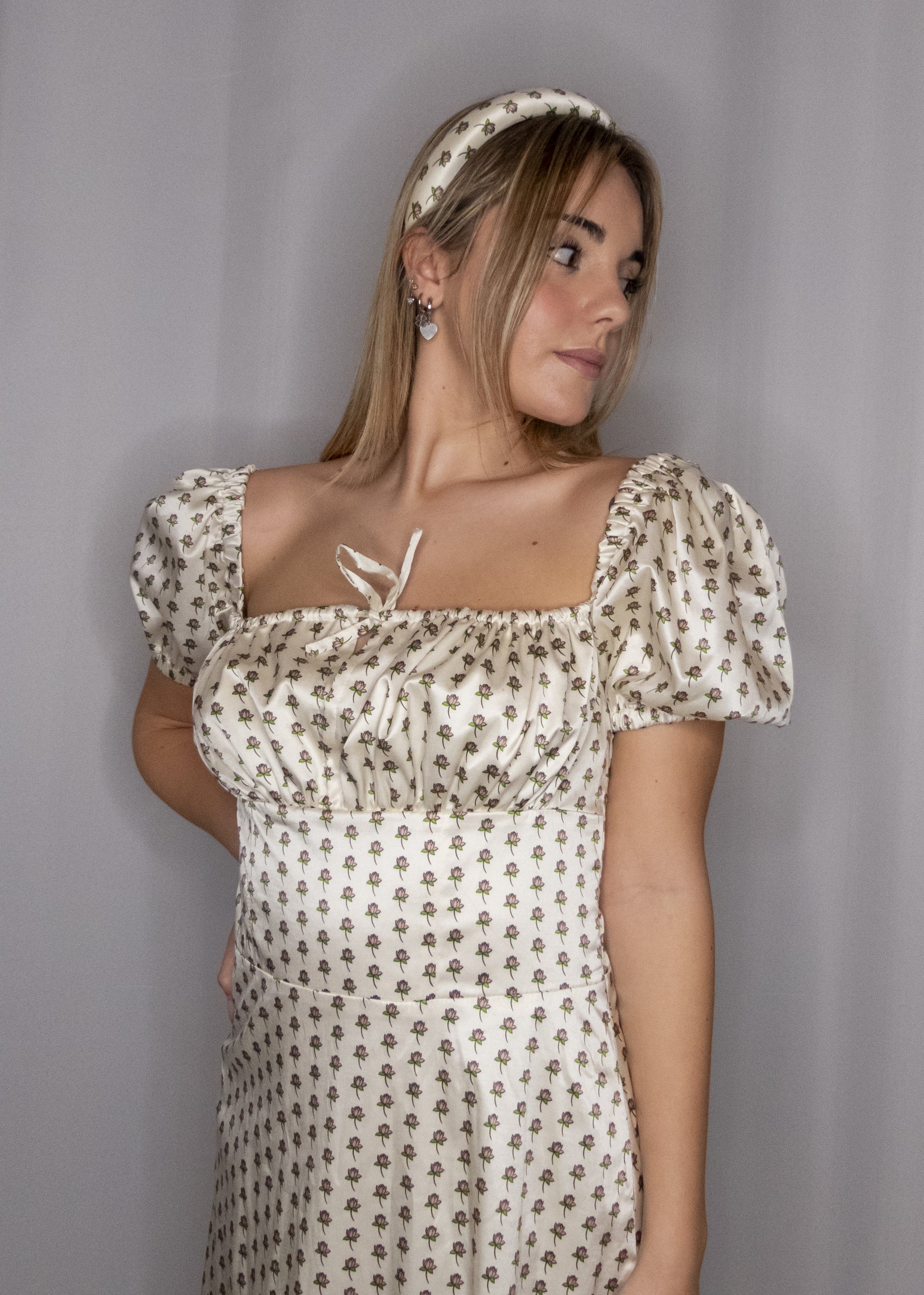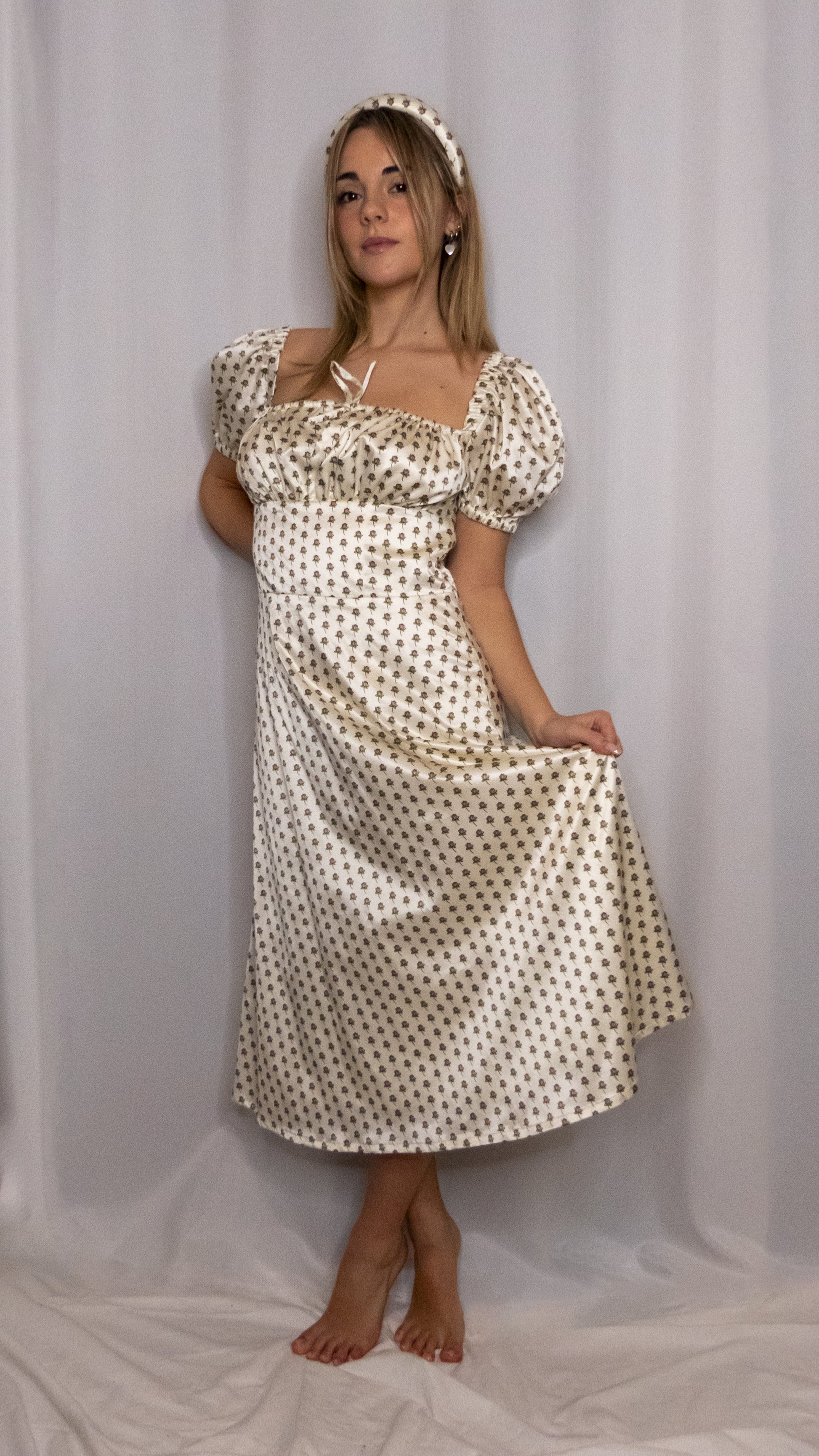 Abito con maniche a sbuffo, arricciato sul petto con laccetto regolabile. Gonna lunga morbida. Fodera interna. Zip invisibile laterale.