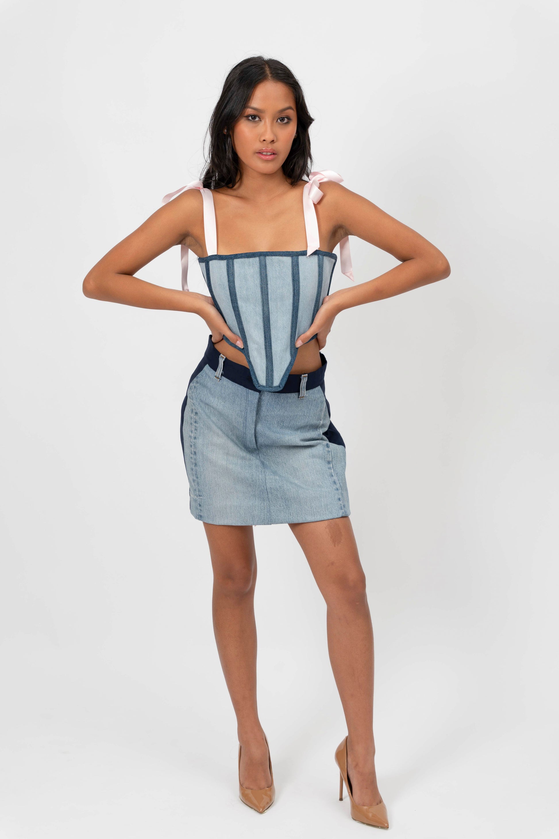 Corsetto realizzato in denim alternato a contrasto, rifinito sopra e sotto e steccato.