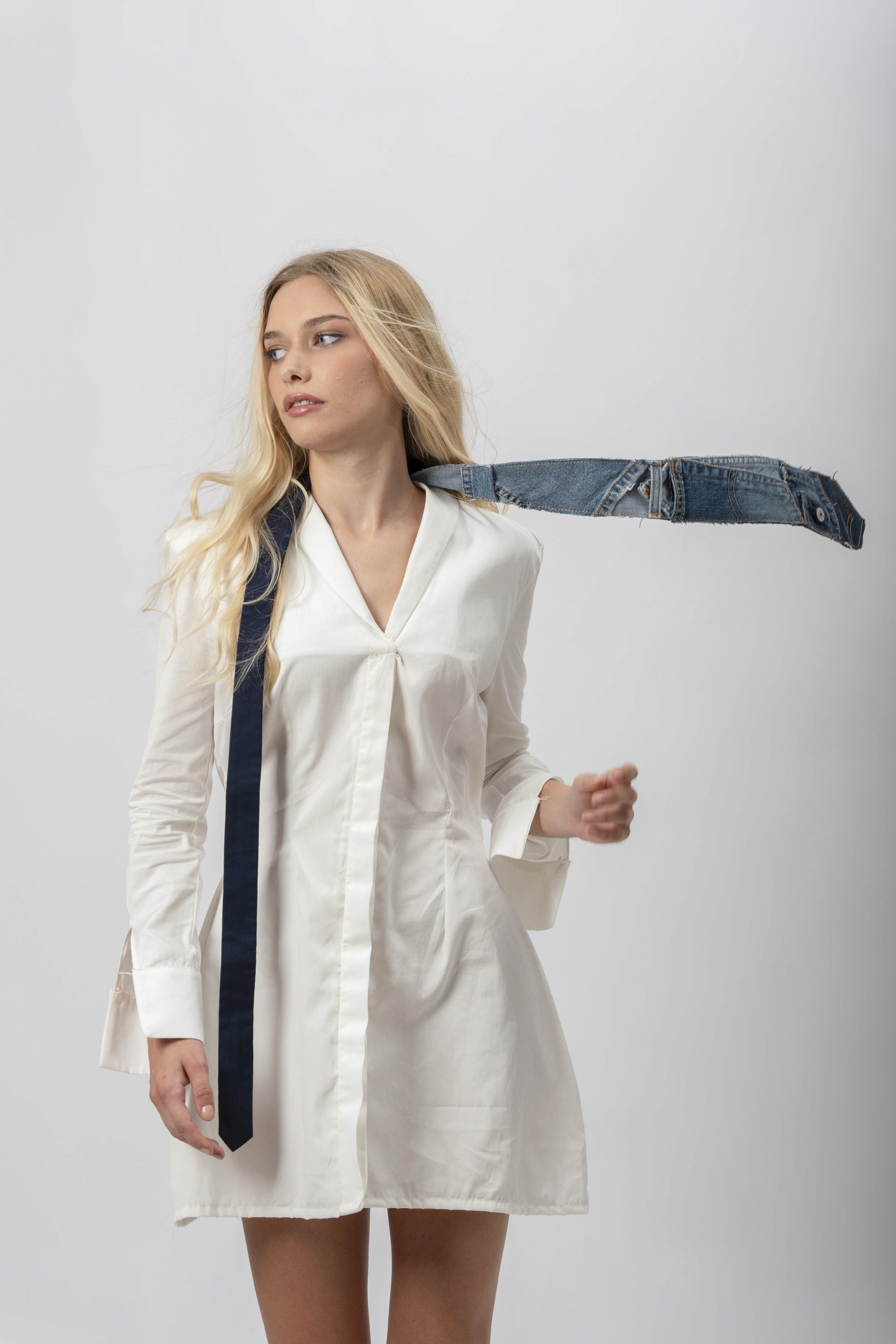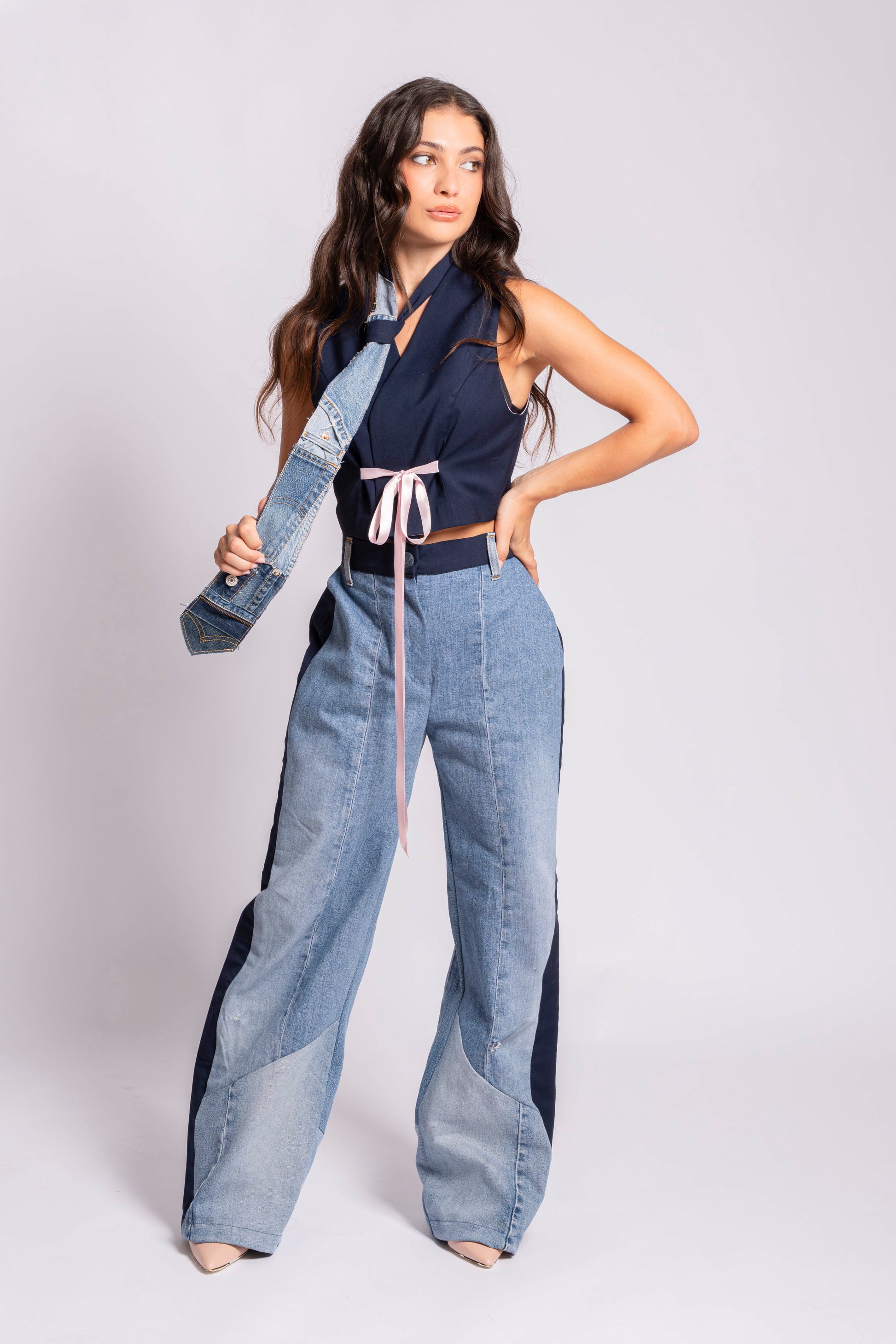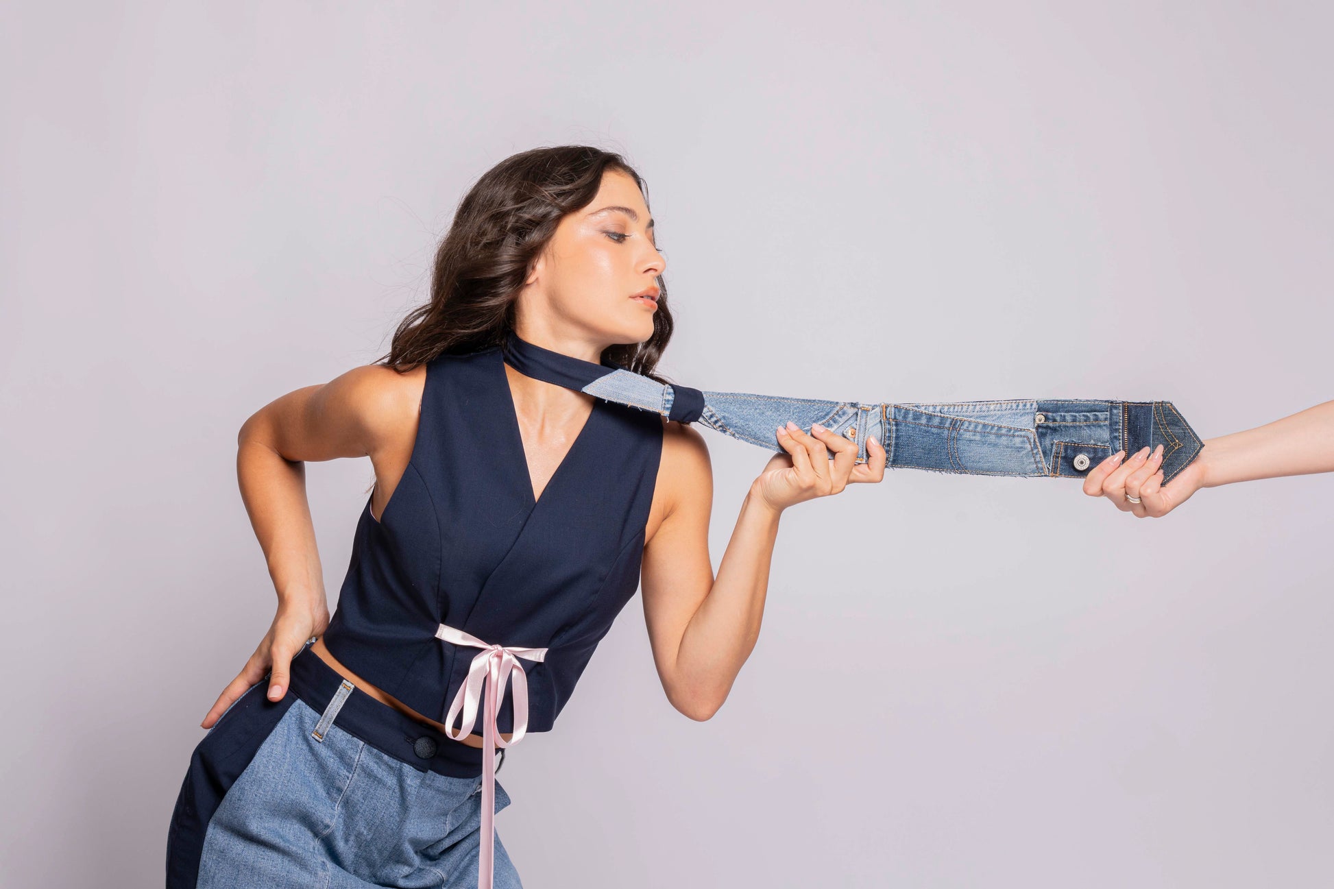 Cravatta in fresco lana, realizzata con scarti di denim.