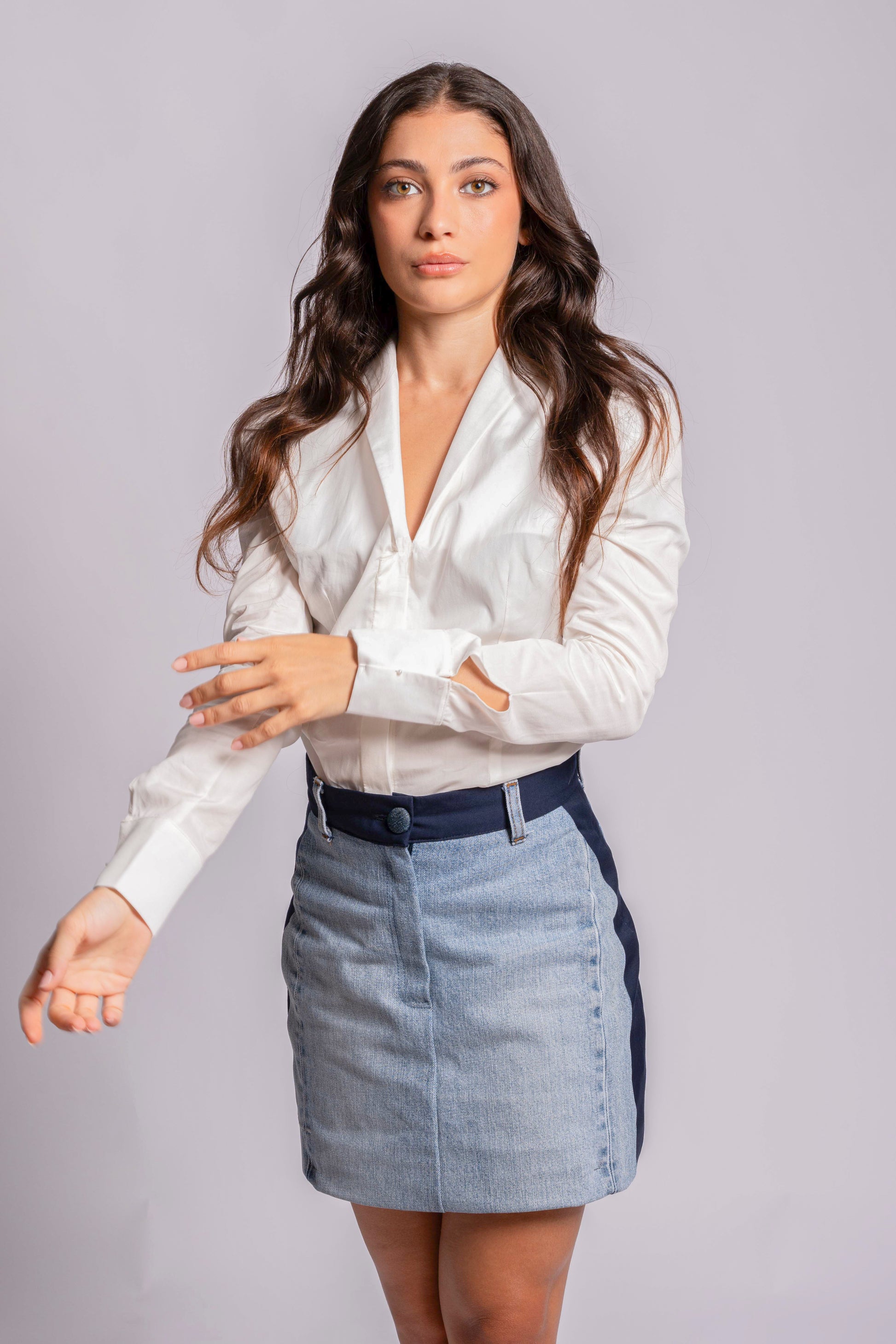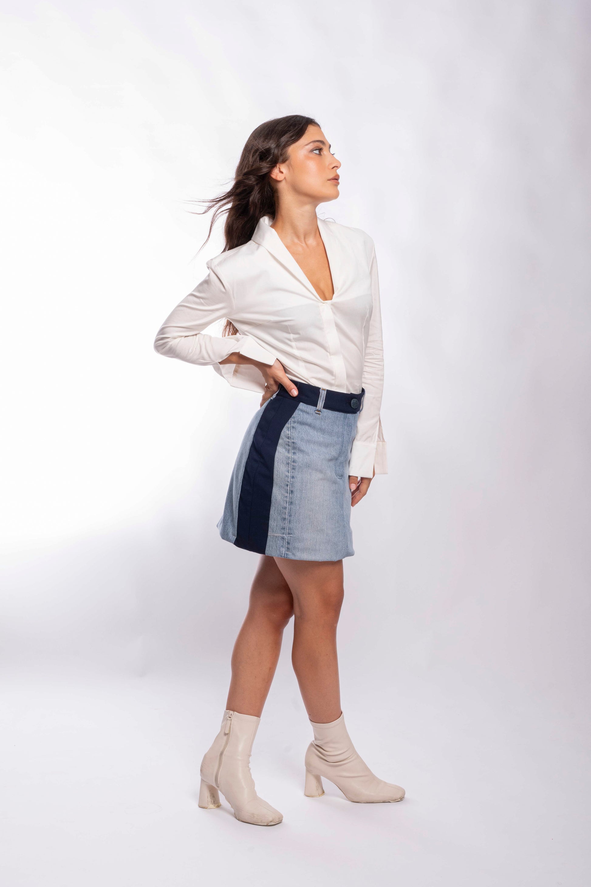 Gonna realizzata in denim con fianchetti in fresco lana blu. Cintura in fresco lana. Bottone ricoperto in denim. Chiusura con lampo.