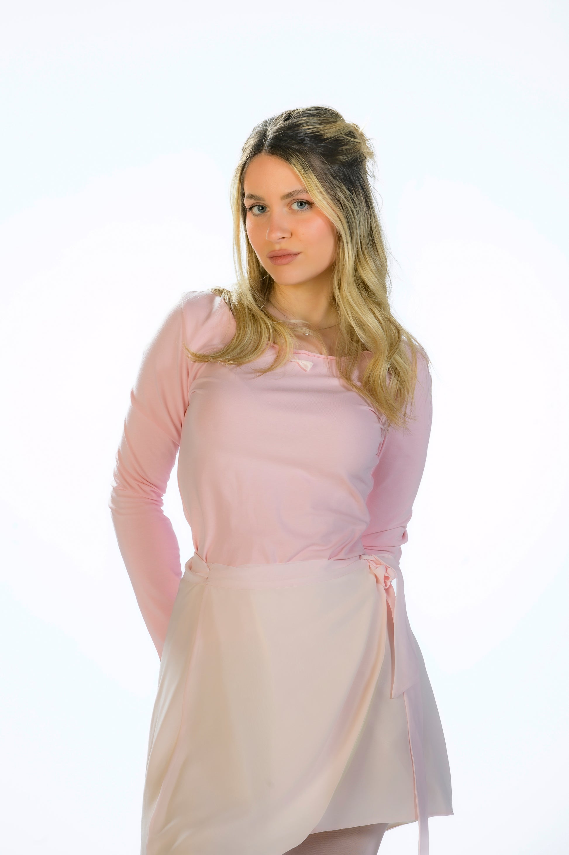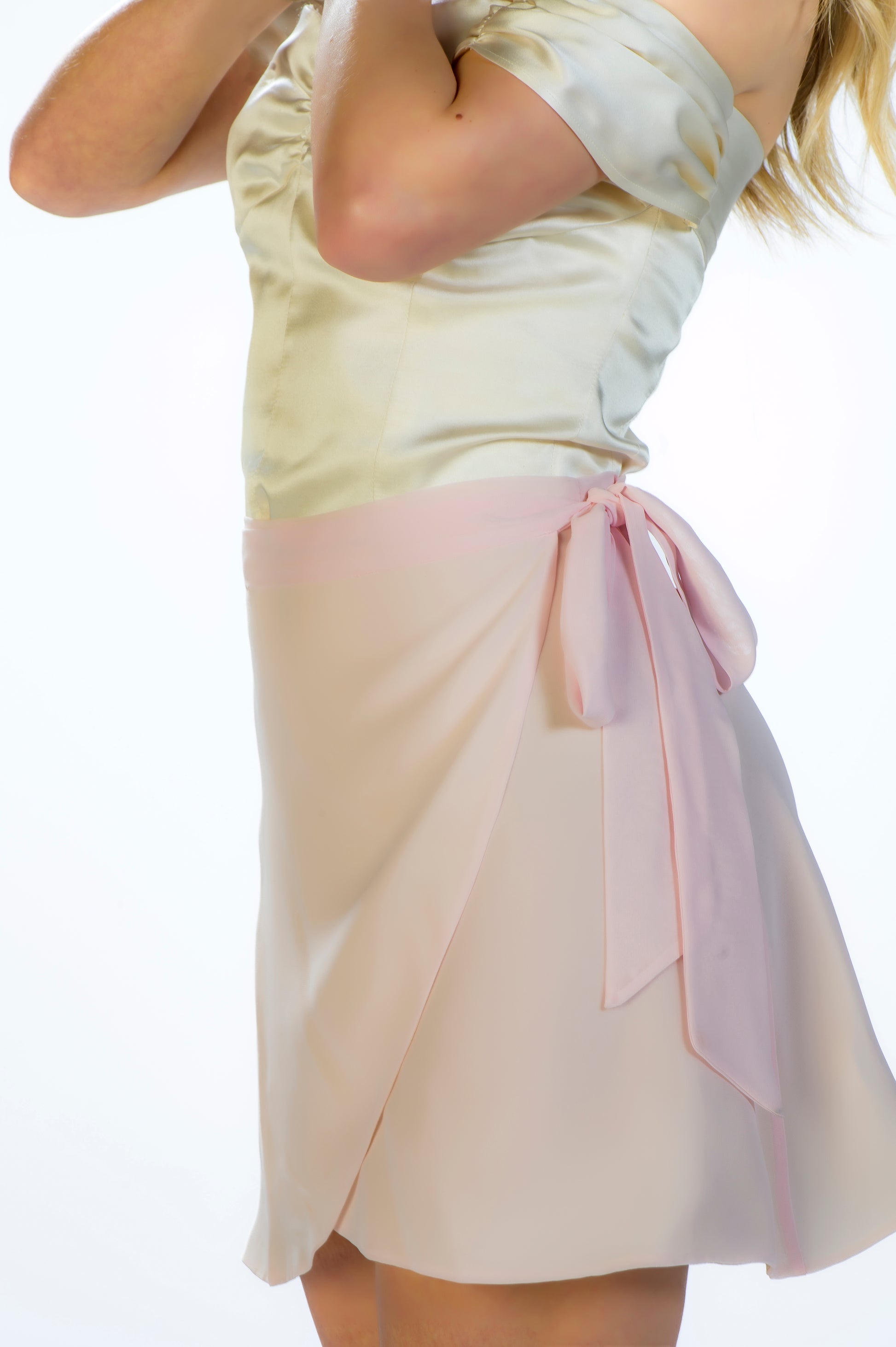 Gonna leggera, corta, rosa, in viole. Chiusura con laccio regolabile.ย