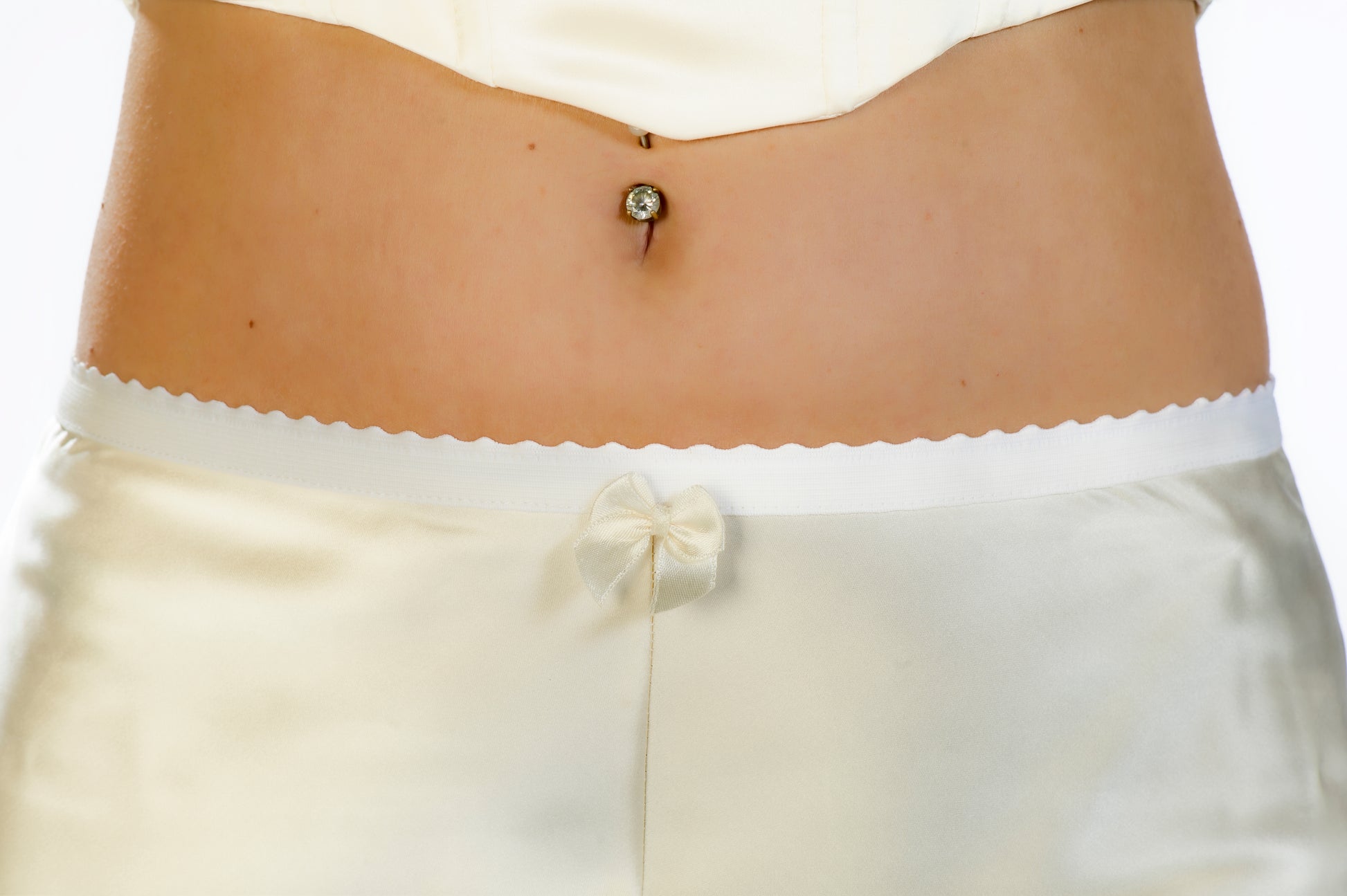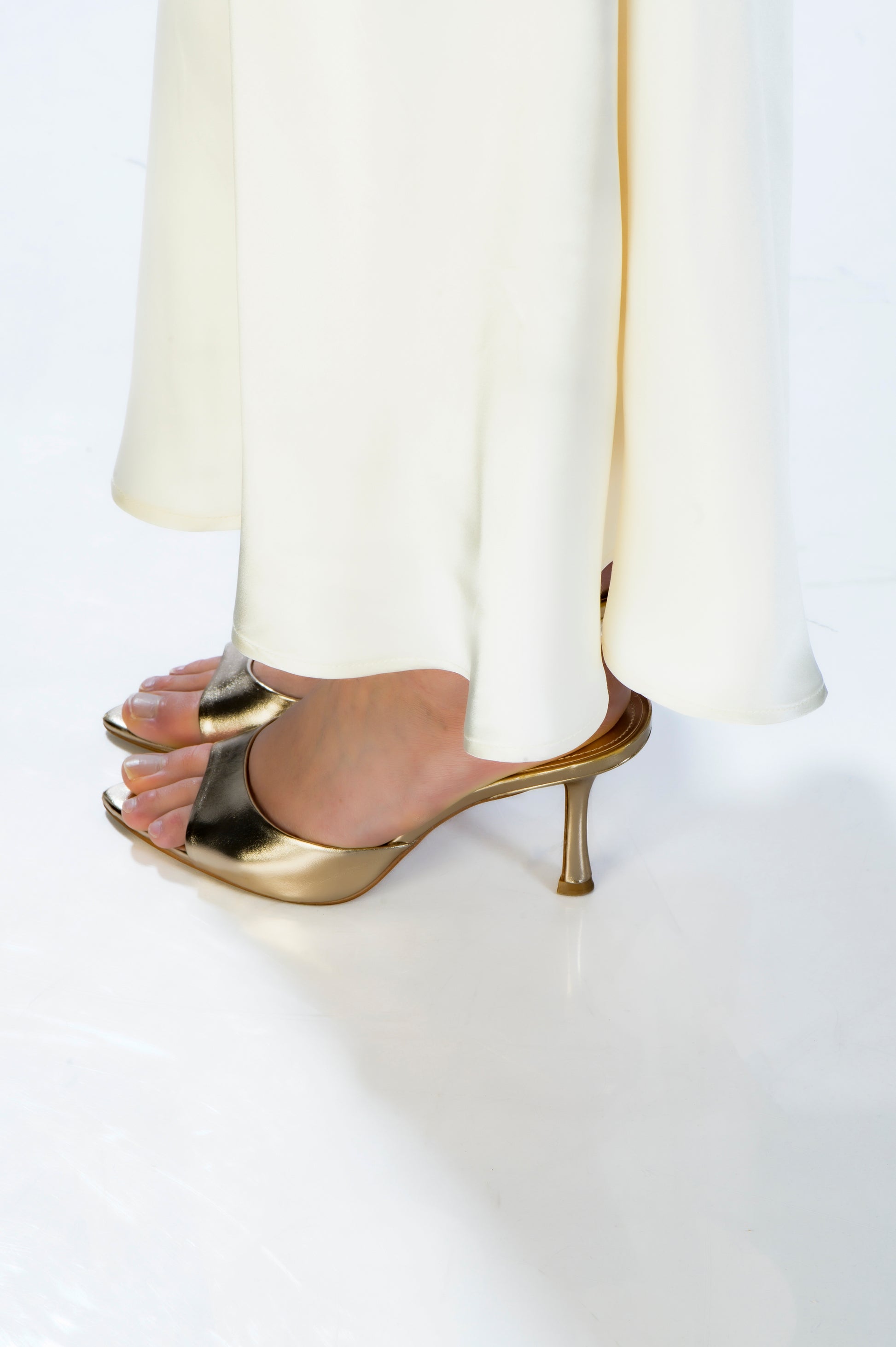 Gonna longuette morbida satin in misto seta, color panna. Dettaglio fiocco in vita al centro.