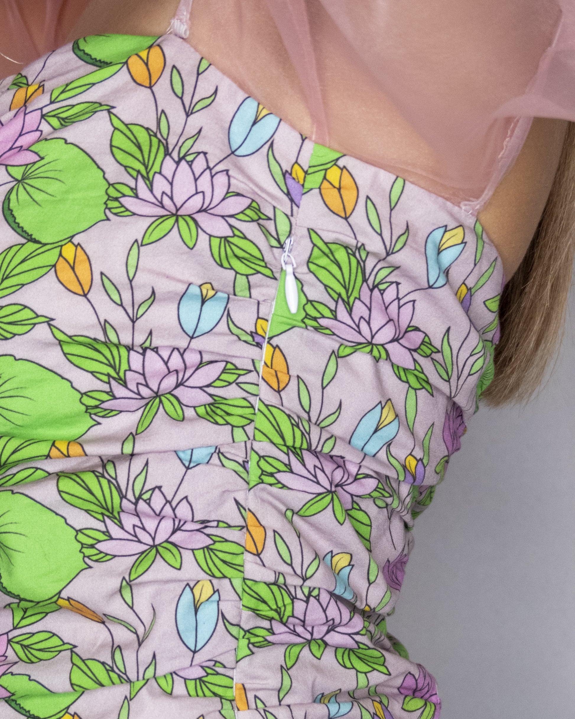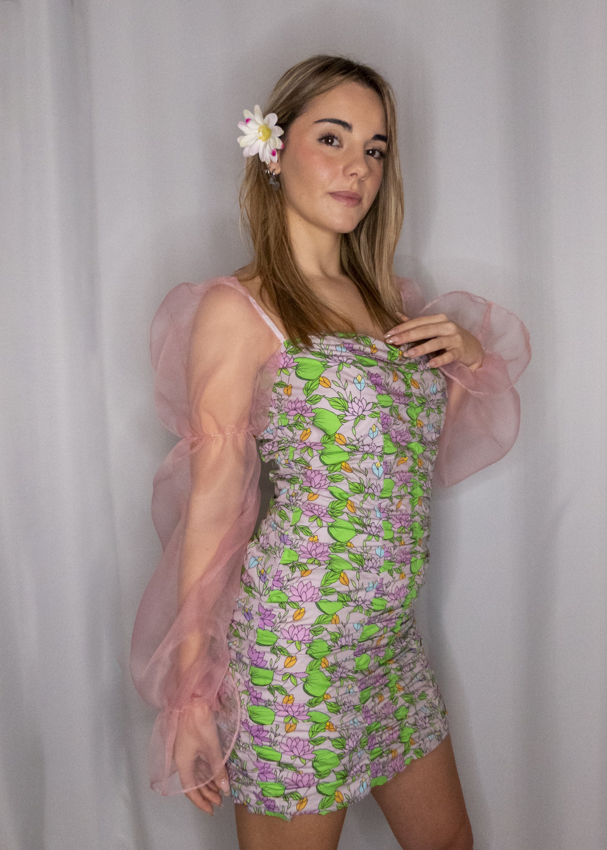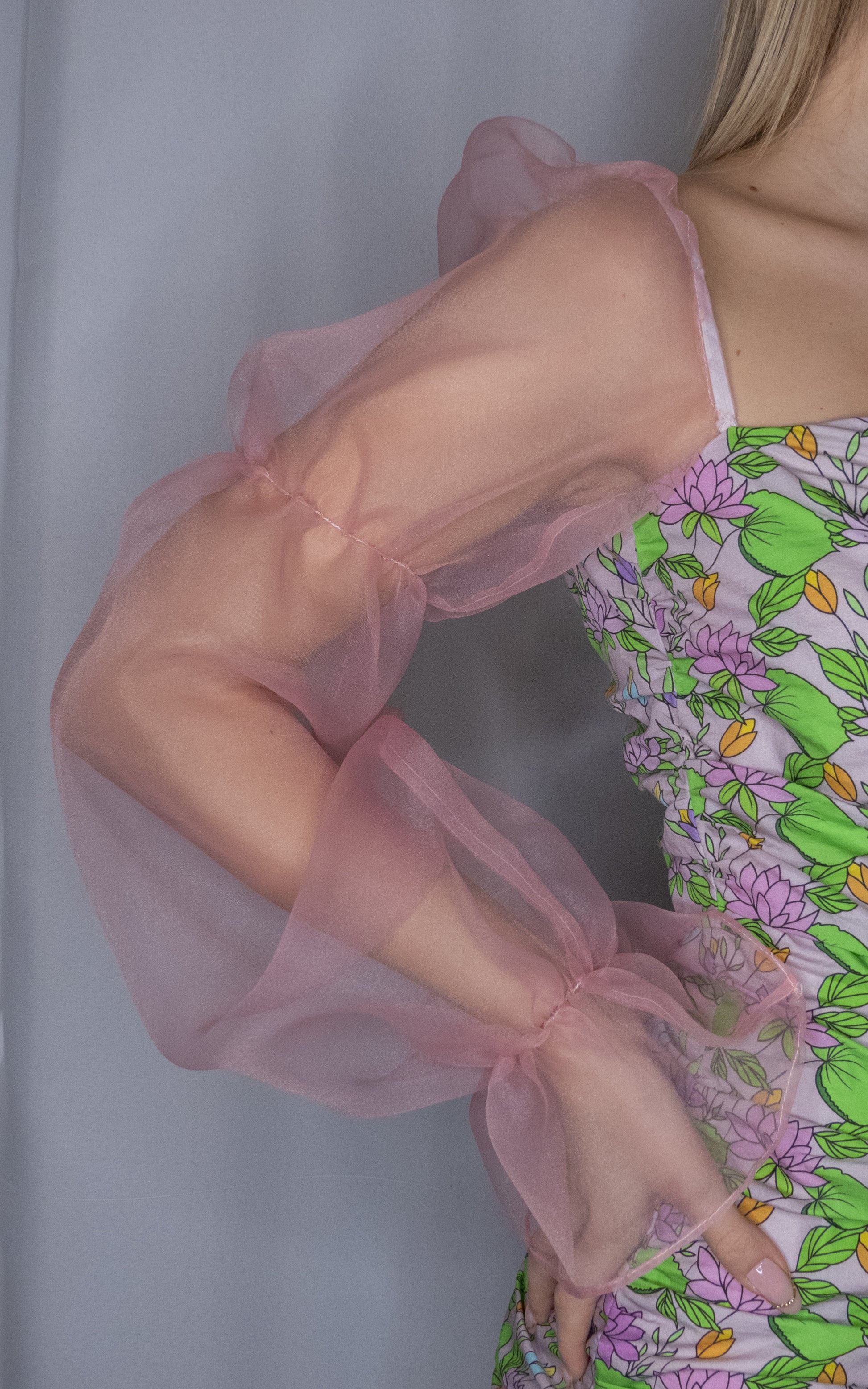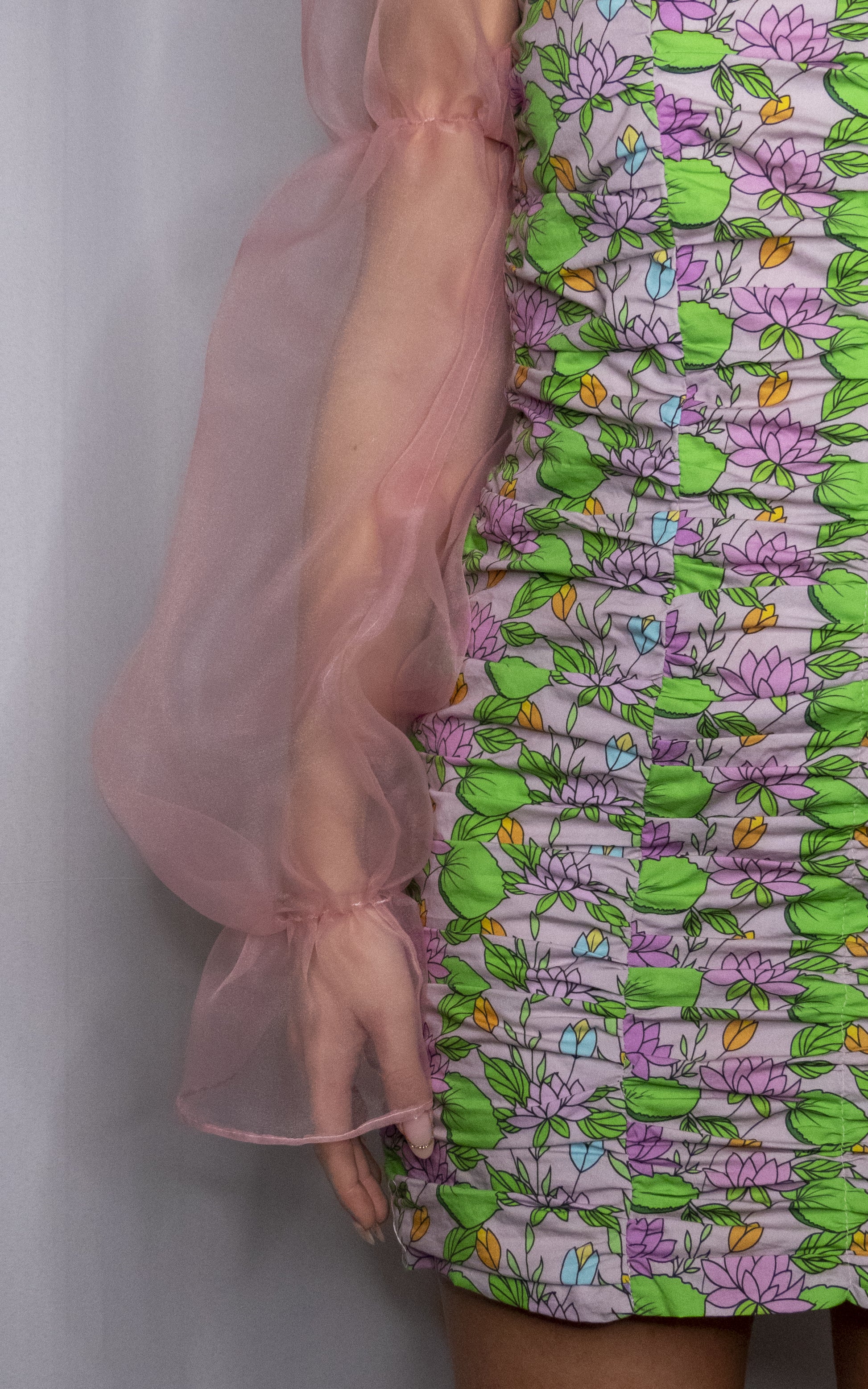 Abito corto in popeline arricciato dalla silhouette a tubino. Scollo leggermente a cuore. Zip invisibile laterale. Maniche lunghe a sbuffo in organza rosa trasparente.