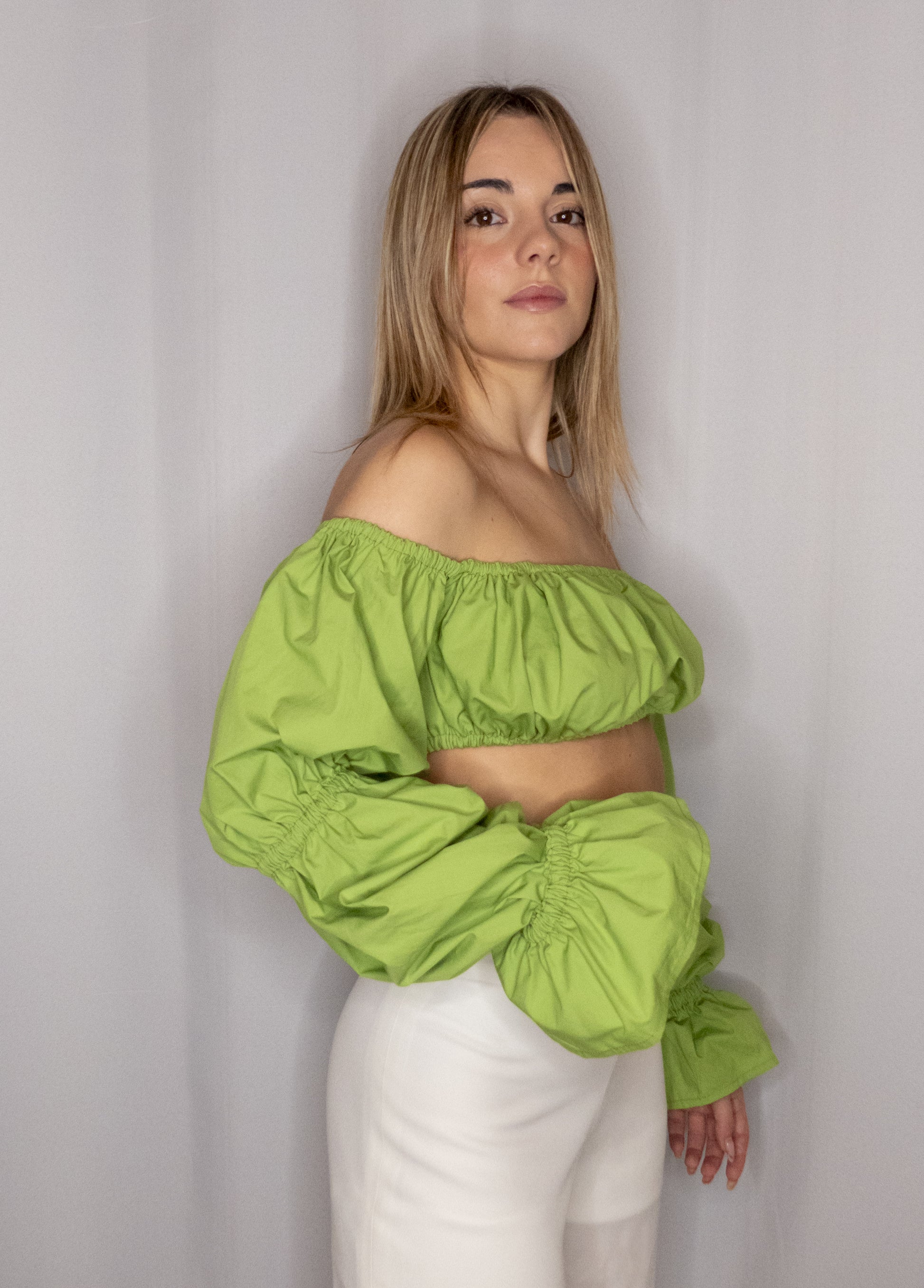 Top in popeline verde a fascia elasticizzato. Maniche lunghe a sbuffo con elastici.ย