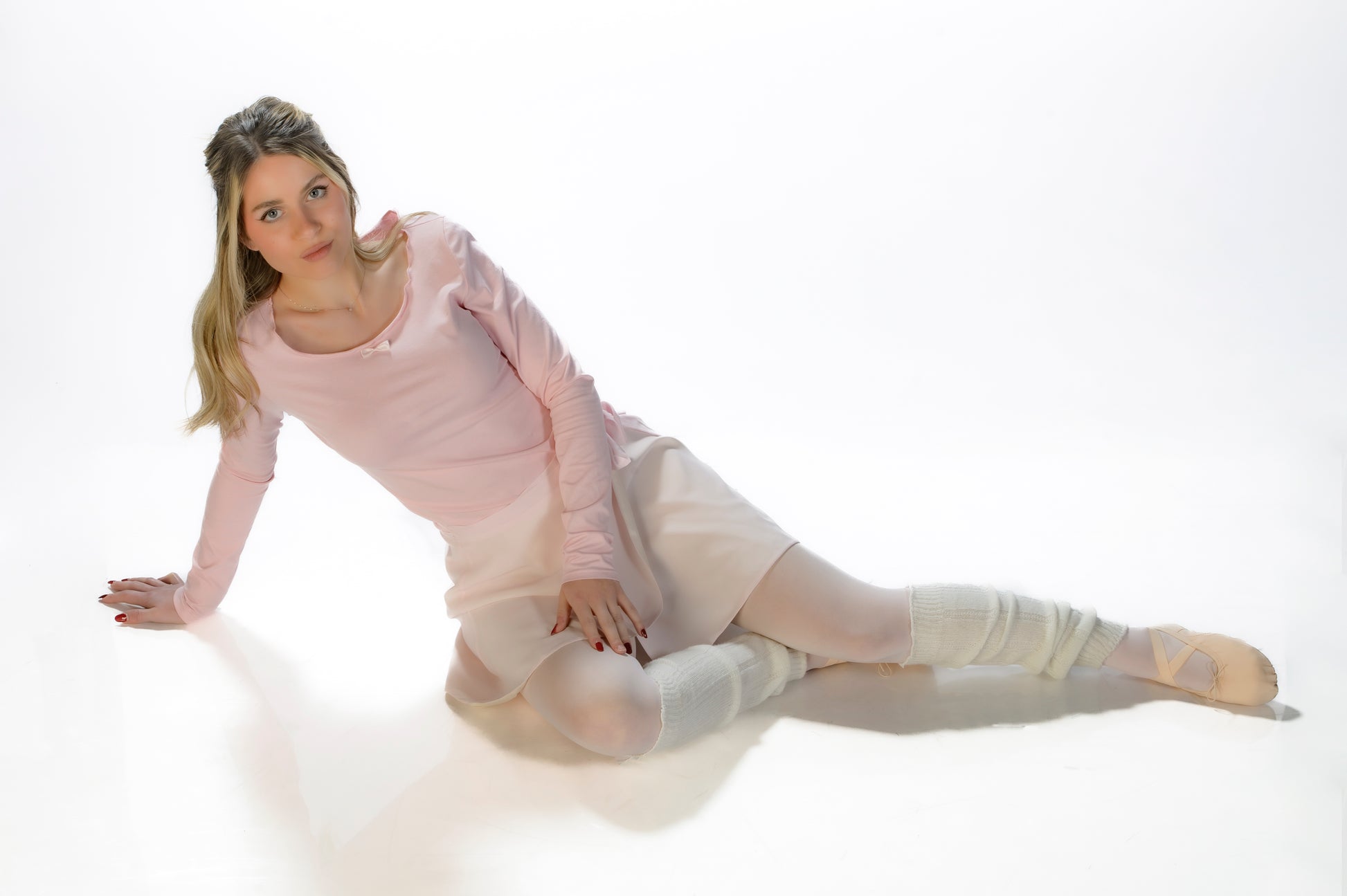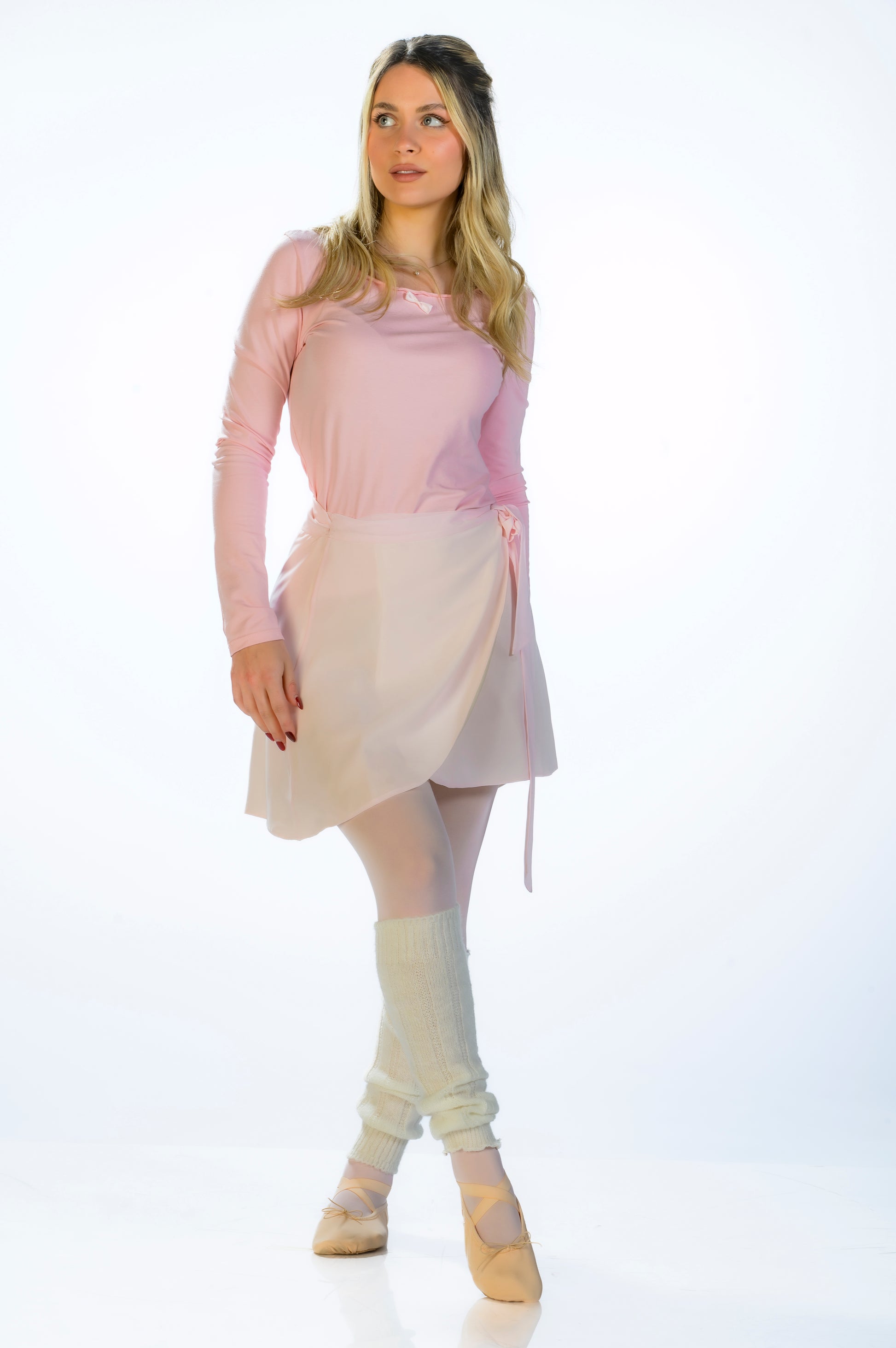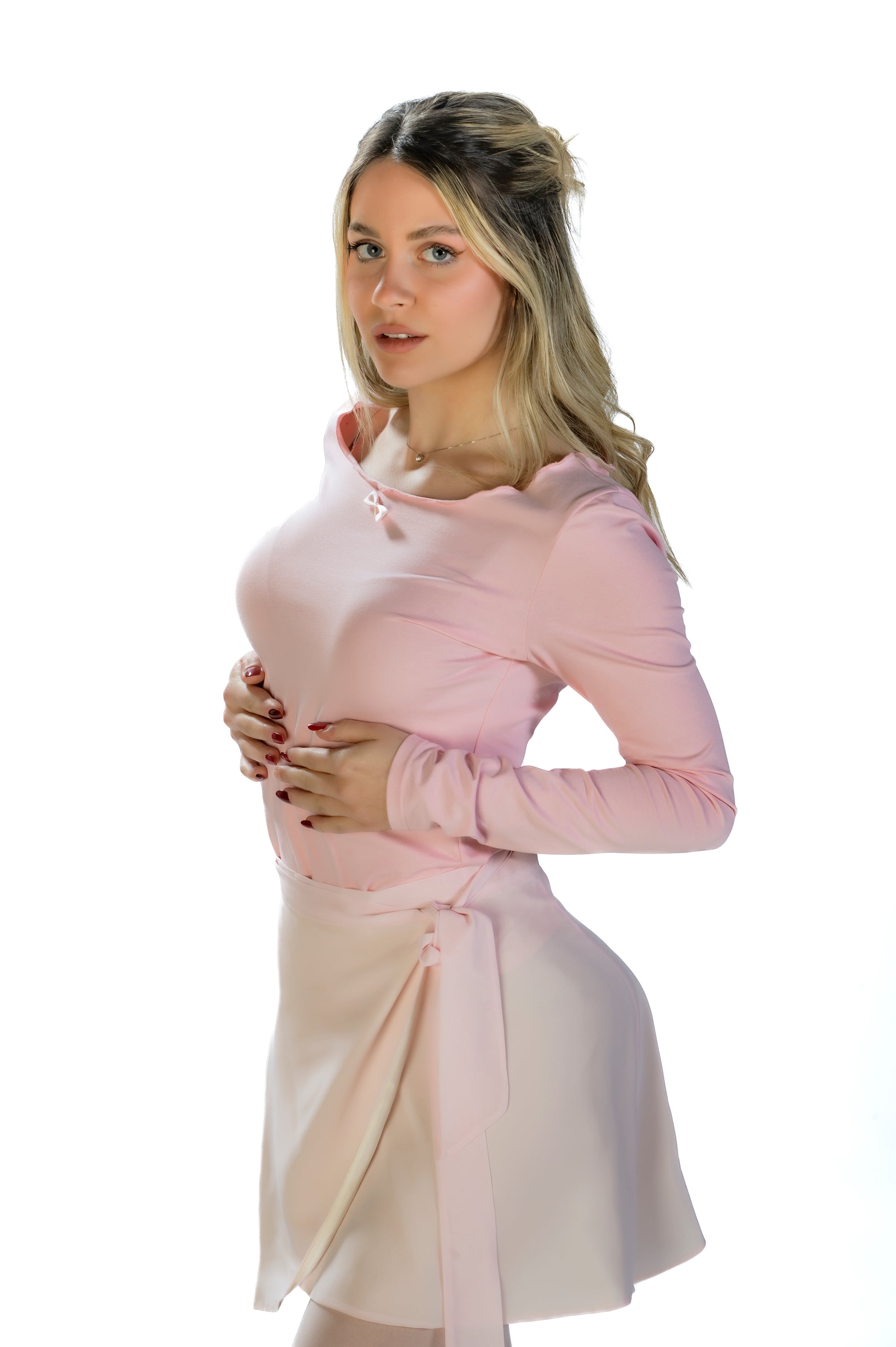 Maglietta rosa aderente morbida in cotone elasticizzato. Dettaglio fiocco al centro.ย